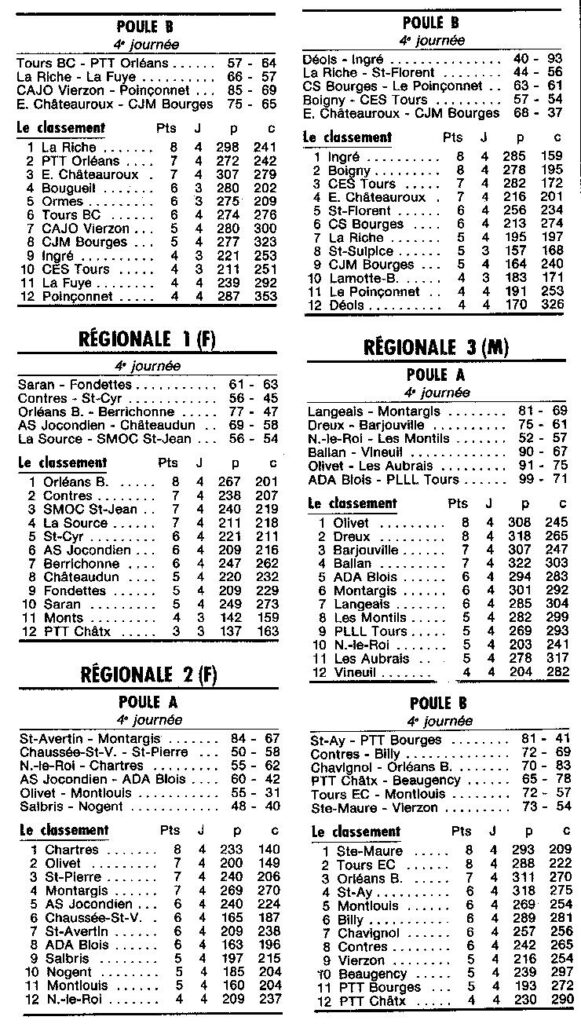 Saison 1994-1995 : Résultats et Classements des Championnats Régionaux après la 4ème Journée