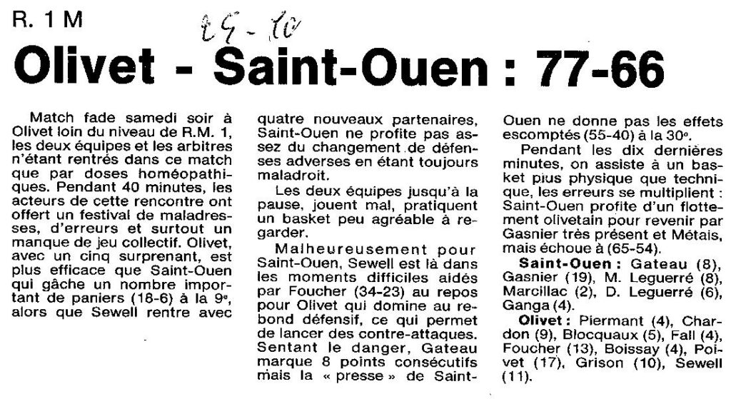 Saison 1994-1995 : En Championnat Régionale Masculine 1, Olivet bat Saint Ouen Vendôme
