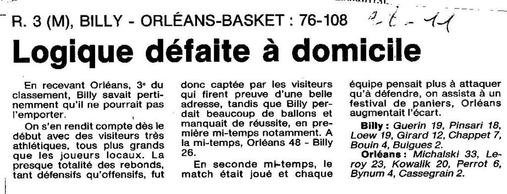 Saison 1994-1995 : En Championnat Régionale Masculine 3, Orléans bat Billy
