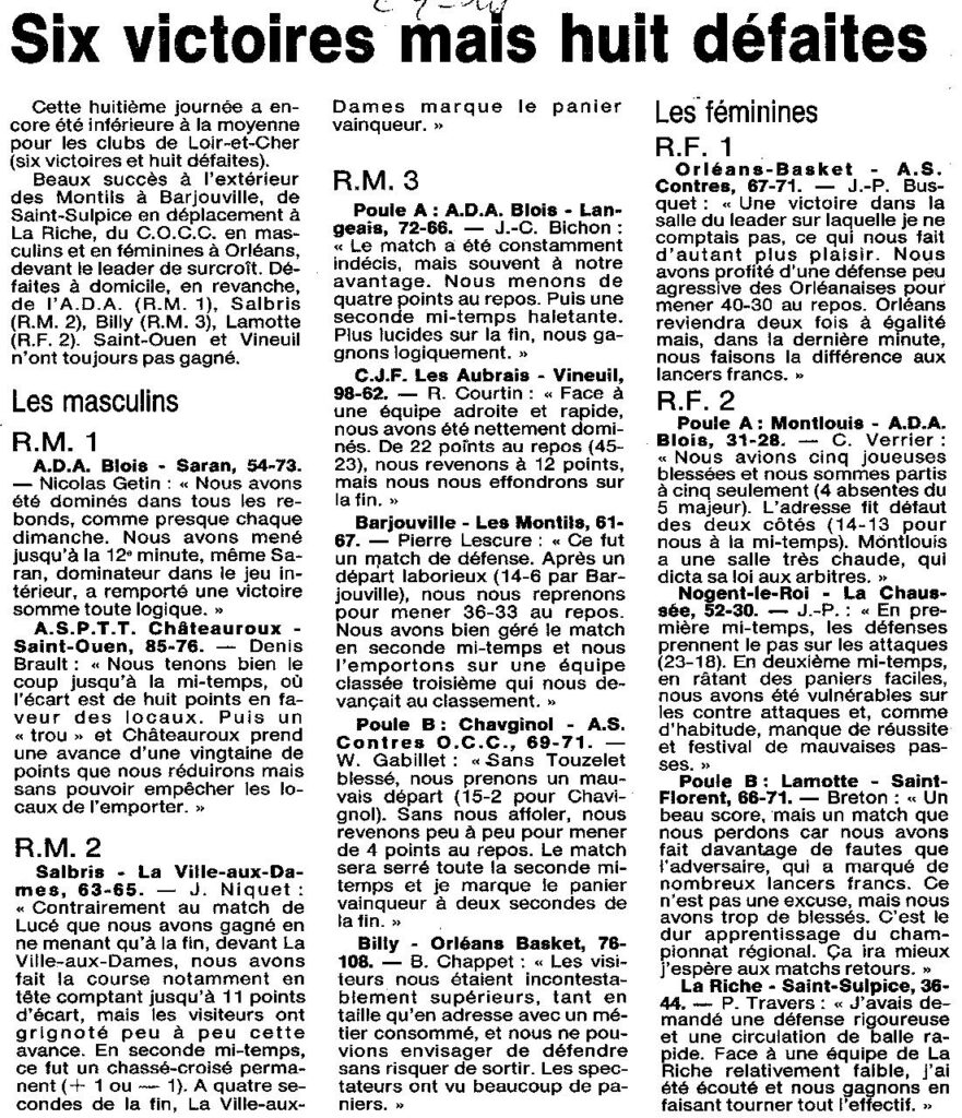 Saison 1994-1995 : Résultats de la 8ème Journée des équipes du Loir et Cher dans les Championnats Régionaux