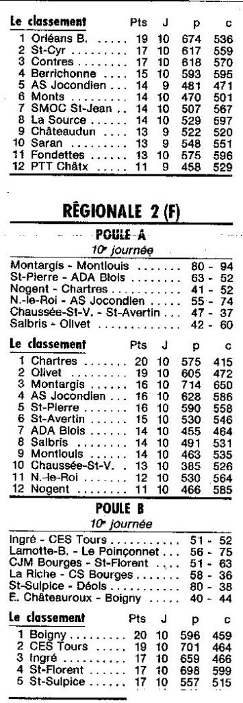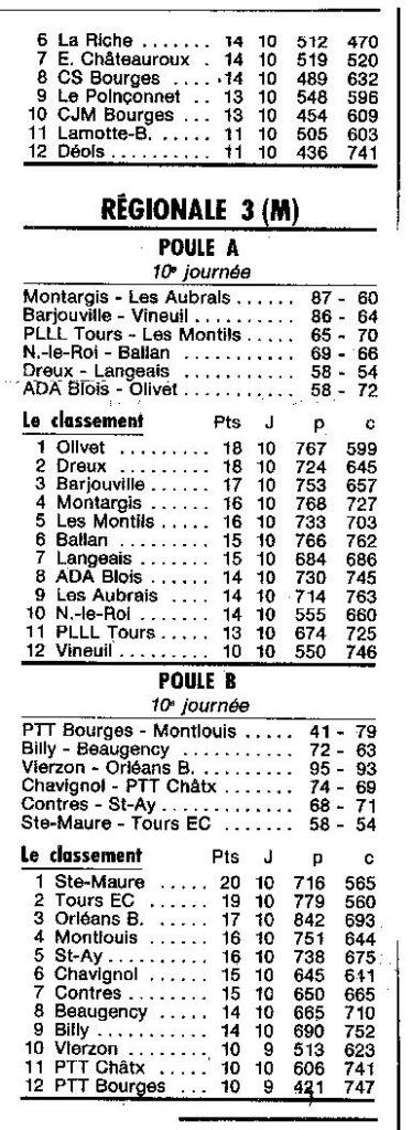 Saison 1994-1995 : Résultats et Classements de tous les Championnats Régionaux après la 10ème Journée