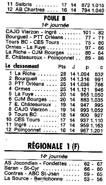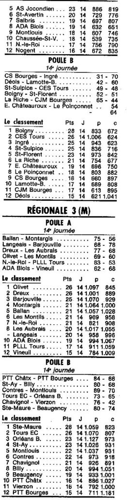 Saison 1994-1995 : Résultats et Classements de tous les Championnats Régionaux après la 14ème Journée