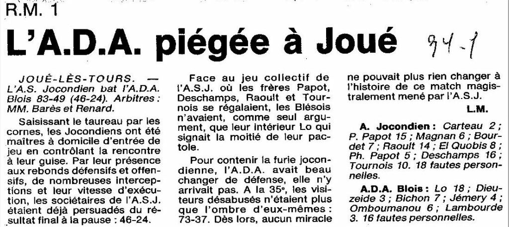 Saison 1994-1995 : En Championnat Régionale Masculine 1, l’AS Joué bat l’ADA Blois