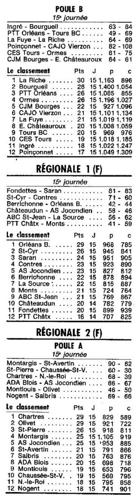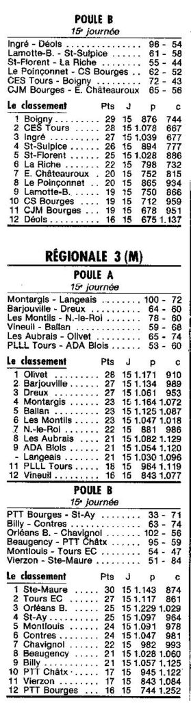 Saison 1994-1995 : Résultats et Classements de tous les Championnats Régionaux après la 15ème journée