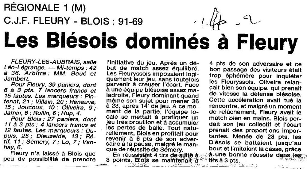 Saison 1994-1995 : En Championnat Régionale Masculine 1, le CJF Les Aubrais bat l’ADA Blois
