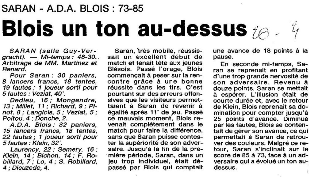 Saison 1994-1995 : En Championnat Régionale Masculine 1, l’ADA Blois bat l’USM Saran