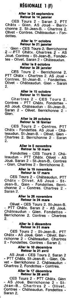 Saison 1995-1996 : Calendrier du Championnat de Régionale Féminine 1