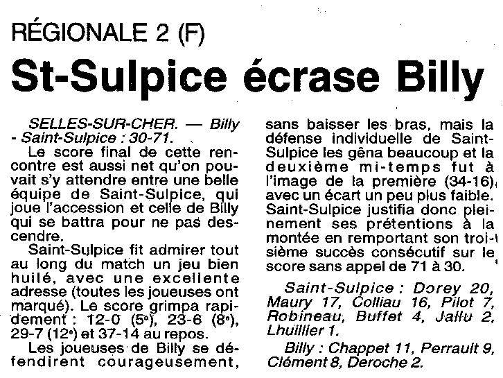 Saison 1995-1996 : En Championnat Régionale Féminine 2, Billy bat St Sulpice
