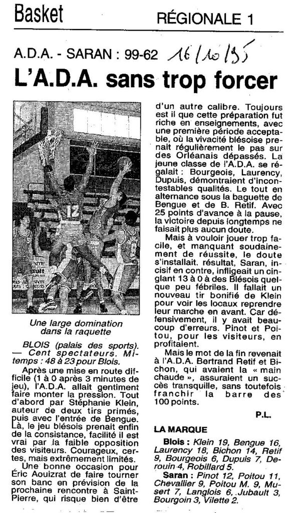 Saison 1995-1996 : En Régionale Masculine 1, l’ADA Blois bat Saran
