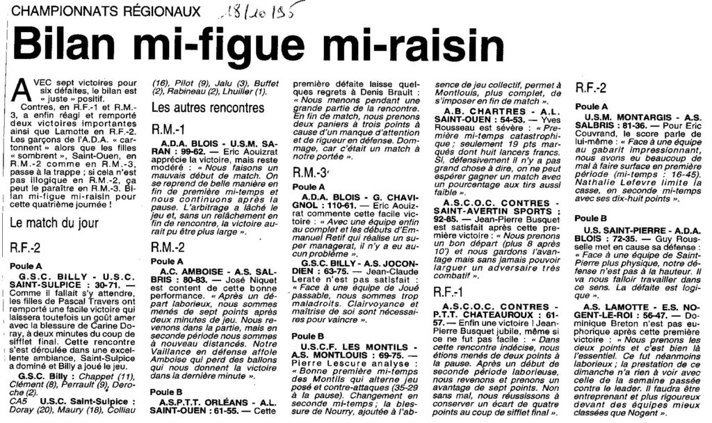 Saison 1995-1996 : Résultats de la 4ème Journée des équipes du Loir et Cher dans les Championnats Régionaux