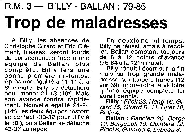 Saison 1995-1996 : En Championnat Régionale Masculine 3, Ballan s’impose à Billy