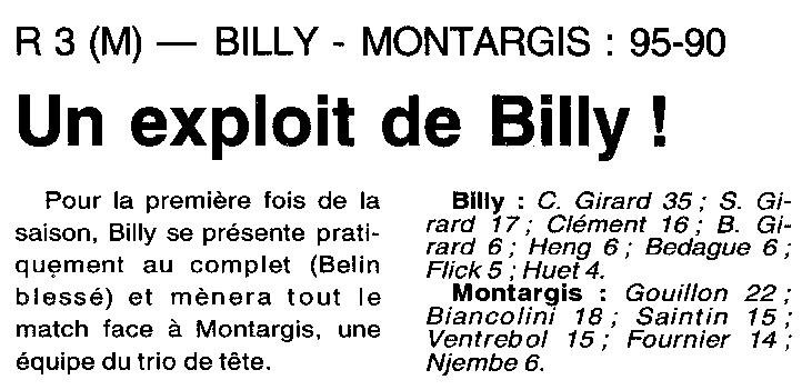 Saison 1995-1996 : En Championnat Régionale Masculine 3, Billy bat Montargis