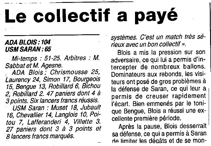Saison 1995-1996 : En Championnat Régionale Masculine 1, l’ADA Blois bat USM Saran