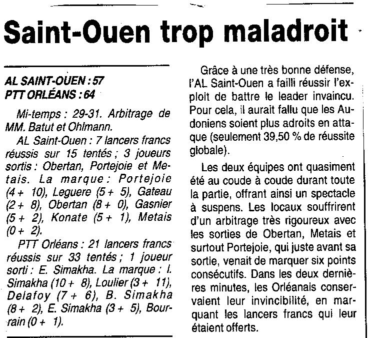 Saison 1995-1996 : En Championnat Régionale Masculine 2, les PTT Orléans s’imposent face à St Ouen