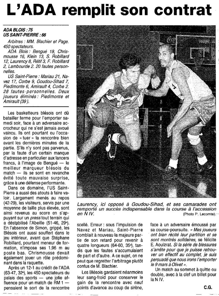 Saison 1995-1996 : En Championnat Régionale Masculine 1, l’ADA Blois bat l’US St Pierre