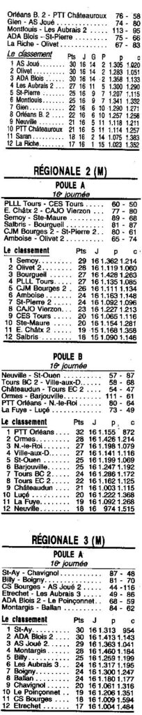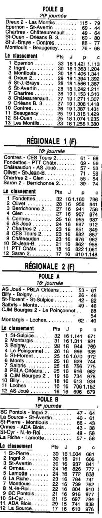 Saison 1995-1996 : Résultats et Classements après la 16ème Journée des Championnats Régionaux