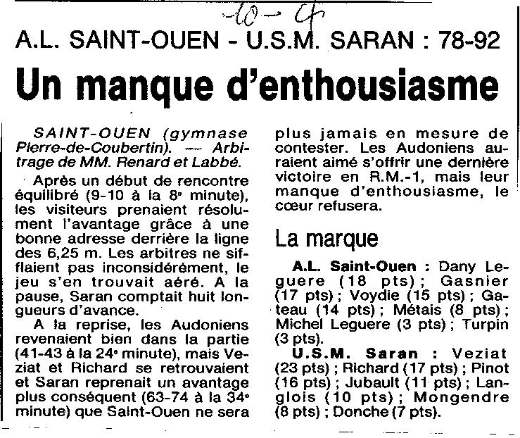 Saison 1995-1996 : En Championnat Régionale Masculine 1, USM Saran bat AL Saint-Ouen