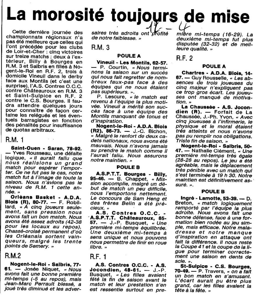 Saison 1995-1996 : Résultats de la 22ème et dernière Journée des équipes du Loir et Cher dans les Championnats Régionaux