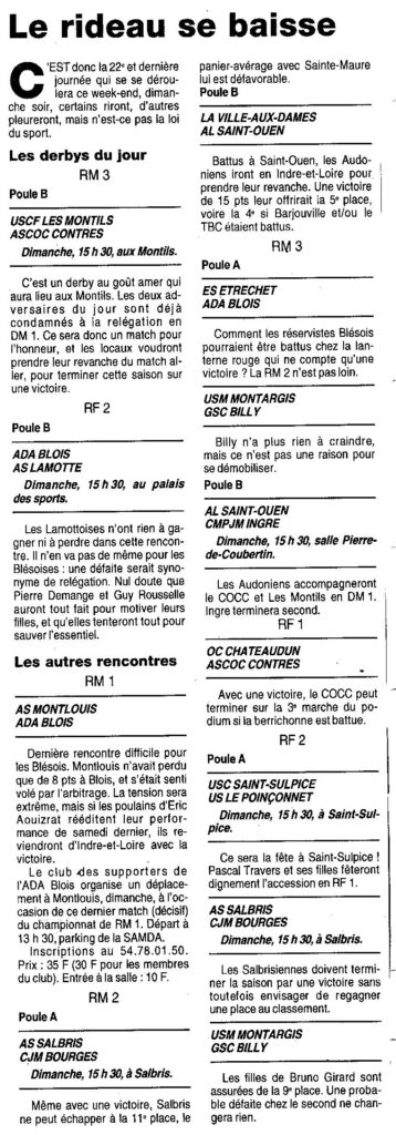 Saison 1995-1996 : Programme de la 22ème et dernière Journée des équipes du Loir et Cher dans les Championnats Régionaux