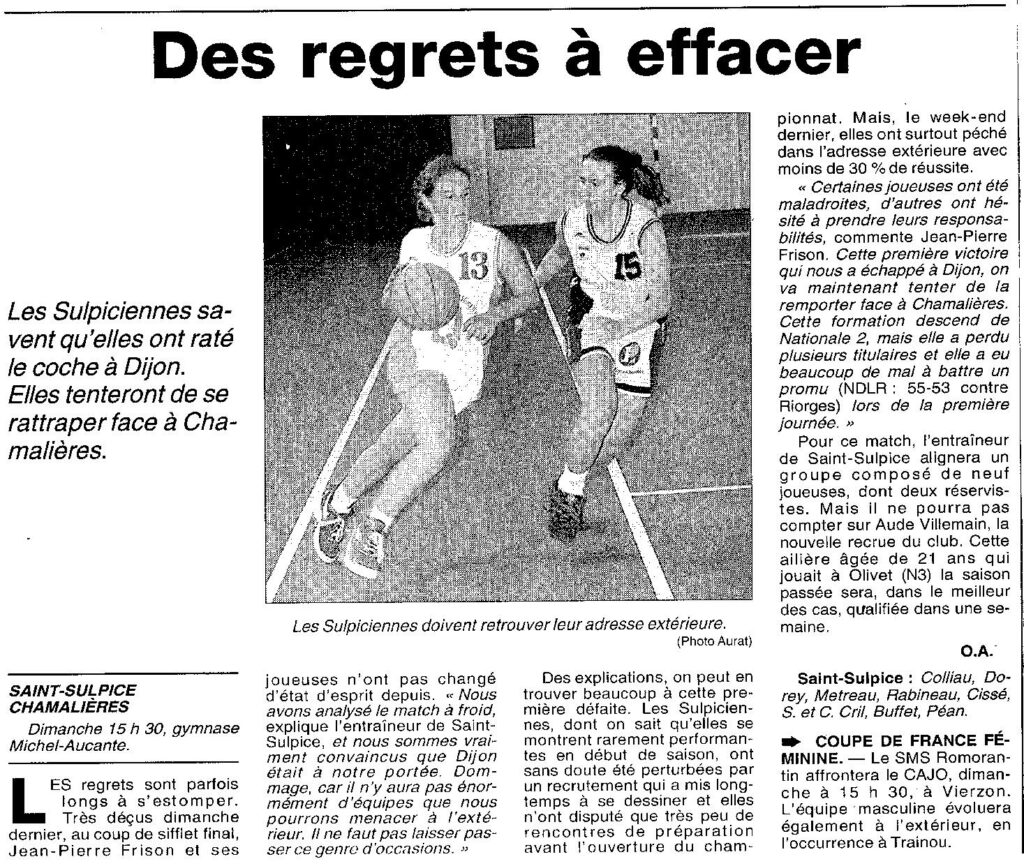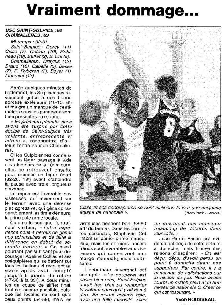 Saison 1998-1999 : En Championnat de Nationale Féminine 3, l’USC St Sulpice s’incline face à Chamalières