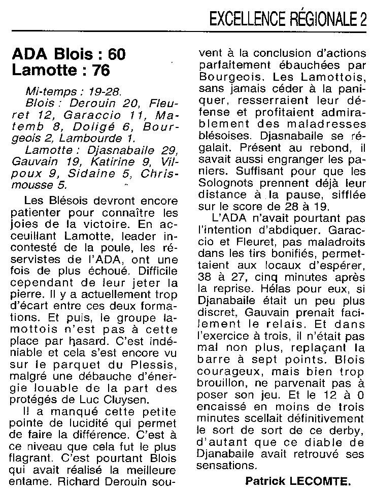 Saison 1998-1999 : En Championnat d’Excellence Régionale Masculine 2, Lamotte Beuvron bat l’ADA Blois