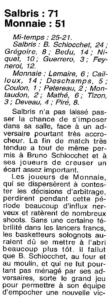 Saison 1998-1999 : En Championnat de Promotion d’Excellence Régionale Masculine, Salbris bat Monnaie