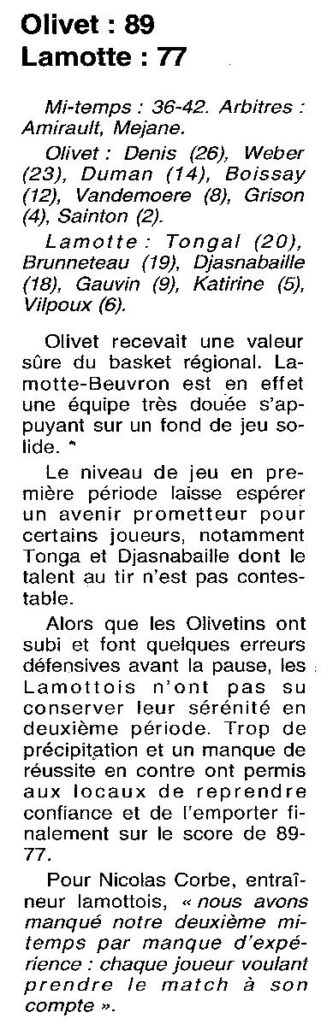 Saison 1998-1999 : En Championnat d’Excellence Régionale Masculine B, Olivet bat Lamotte-Beuvron