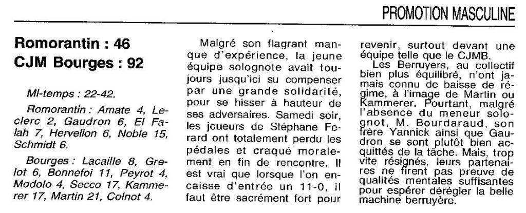 Saison 1998-1999 : En Championnat de Promotion d’Excellence Régionale Masculine, le CJM Bourges bat Romorantin