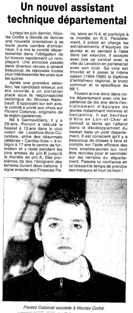 Saison 1999-2000 : Florent Colonval nouvel assistant technique départemental du Loir et Cher