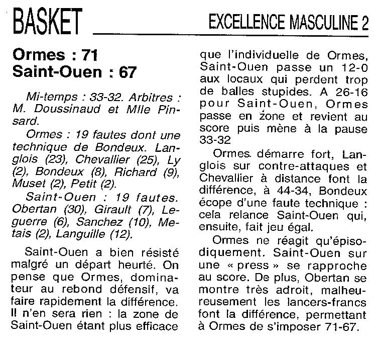 Saison 1999-2000 : En Championnat d’Excellence Régionale Masculine 2 A, Ormes bat St Ouen
