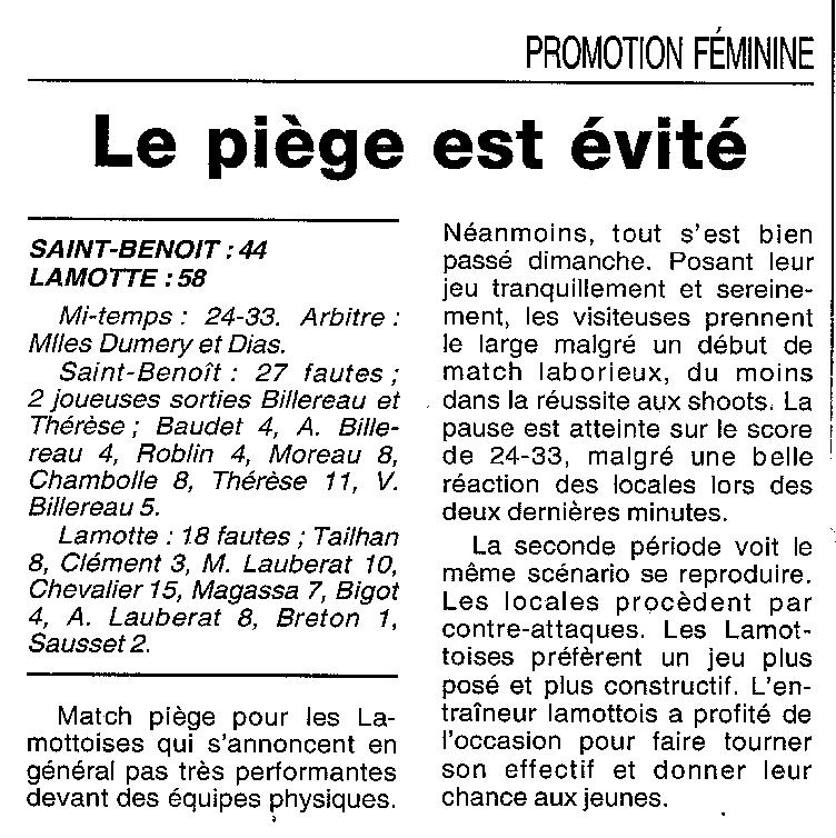 Saison 1999-2000 : En Championnat de Promotion d’Excellence Régionale Féminine B, Lamotte bat St Benoît