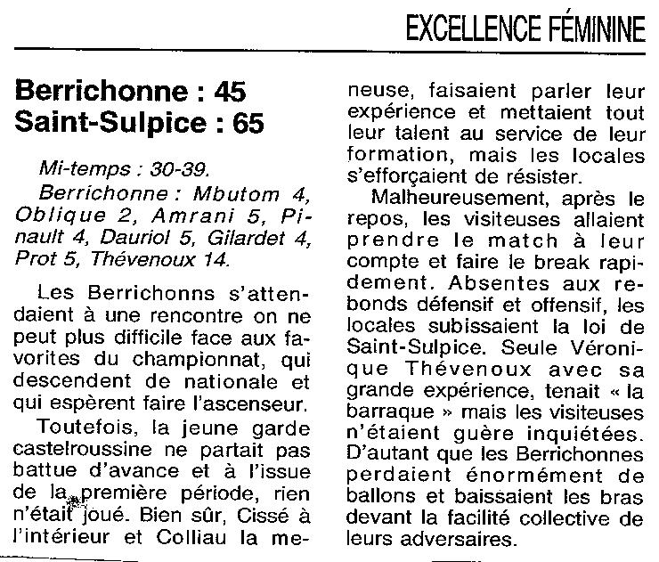 Saison 1999-2000 : En Championnat d’Excellence Régionale Féminine, St Sulpice bat La Berrichonne
