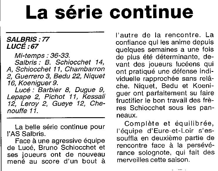 Saison 1999-2000 : En Championnat de Promotion d’Excellence Régionale Masculine, Salbris bat Lucé
