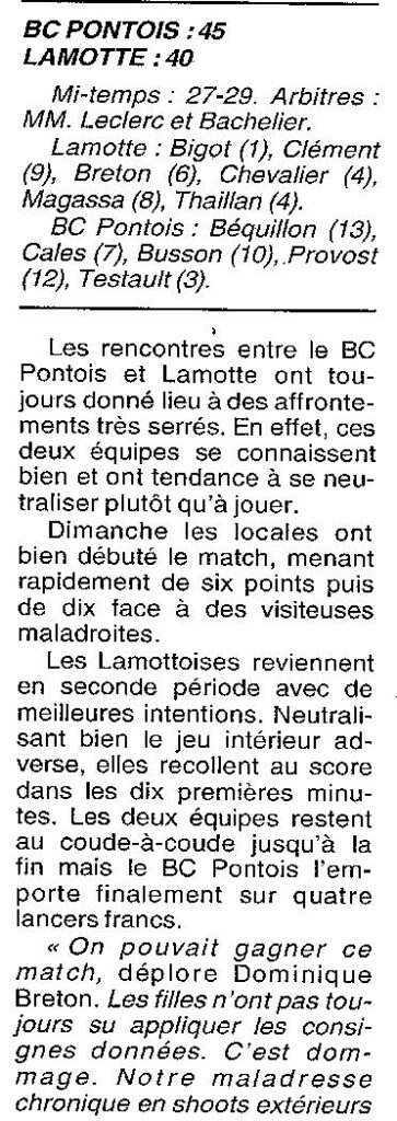Saison 1999-2000 : En Championnat de Promotion d’Excellence Régionale Féminine, BC Pontois bat Lamotte