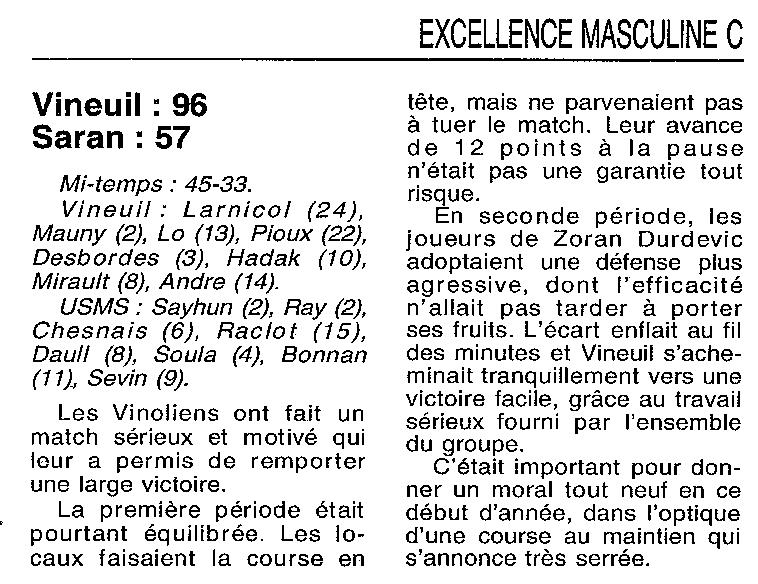 Saison 1999-2000 : En Championnat d’Excellence Régionale Masculine C, Vineuil bat Saran