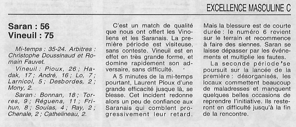Saison 1999-2000 : En Championnat d’Excellence Régionale Masculine C, Vineuil bat Saran