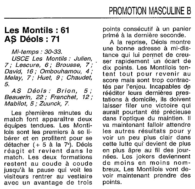 Saison 1999-2000 : En Championnat de Promotion d’Excellence Régionale Masculine, AS Déols bat Les Montils