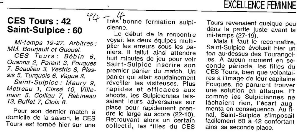 Saison 1999-2000 : En Championnat d’Excellence Régionale Féminine, St Sulpice bat le CES Tours