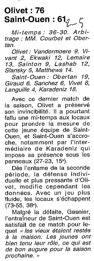 Saison 1999-2000 : En Championnat d’Excellence Régionale Masculine, Olivet bat Saint-Ouen
