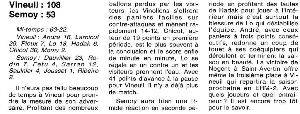 Saison 1999-2000 : En Championnat d’Excellence Régionale Masculine, Vineuil bat Semoy