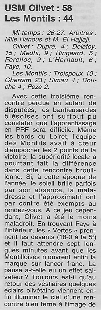 Saison 2000-2001 : En Championnat de Promotion d’Excellence Régionale Féminine A, lors de la Journée du 1er Octobre 2000, l’USM Olivet bat Les Montils