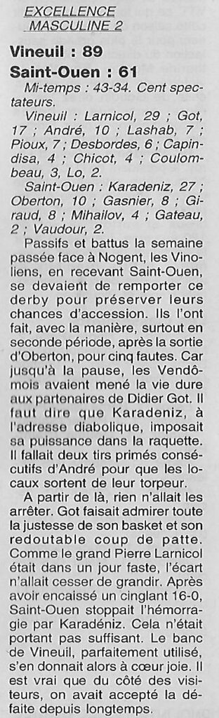 Saison 2000-2001 : En Championnat d’Excellence Régionale Masculine 2B, lors de la Journée du 29 Octobre 2000, Vineuil bat St Ouen