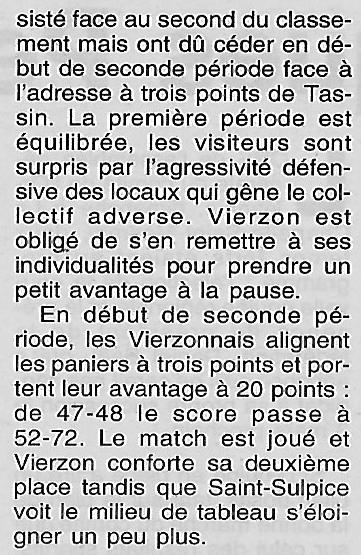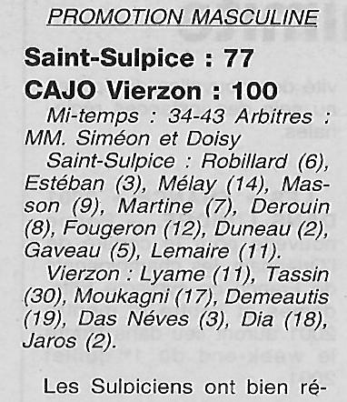 Saison 2000-2001 : En Championnat de Promotion d’Excellence Masculine A, lors de la Journée du 10 Décembre 2000, Le CAJO Vierzon bat Saint-Sulpice