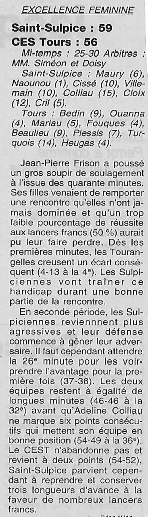 Saison 2000-2001 : En Championnat d’Excellence Régionale Féminine, lors de la Journée 10 Décembre 2000, Saint-Sulpice bat CES Tours