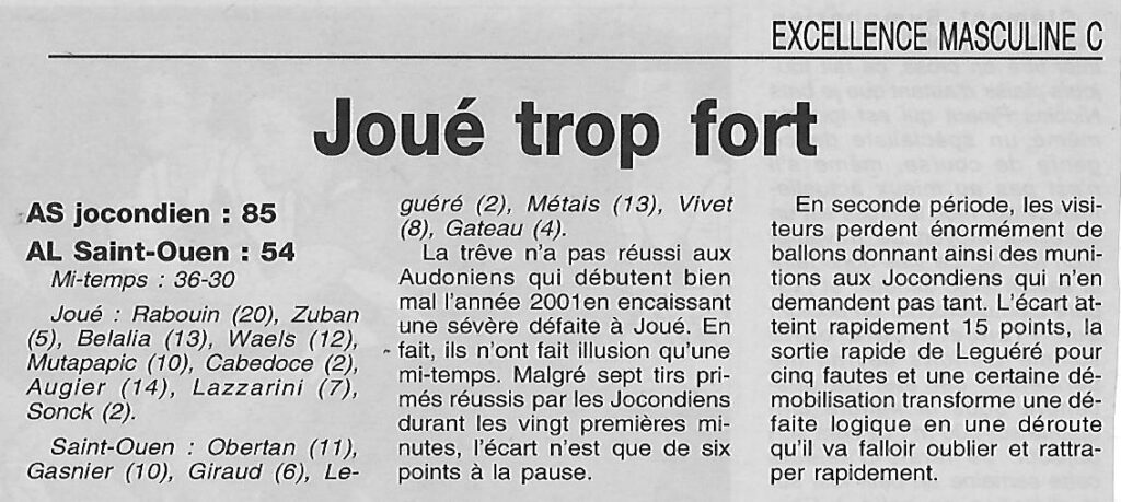 Saison 2000-2001 : En Championnat d’Excellence Régionale Masculine C, lors de la Journée du 7 Janvier 2001, Joué les Tours bat Saint-Ouen
