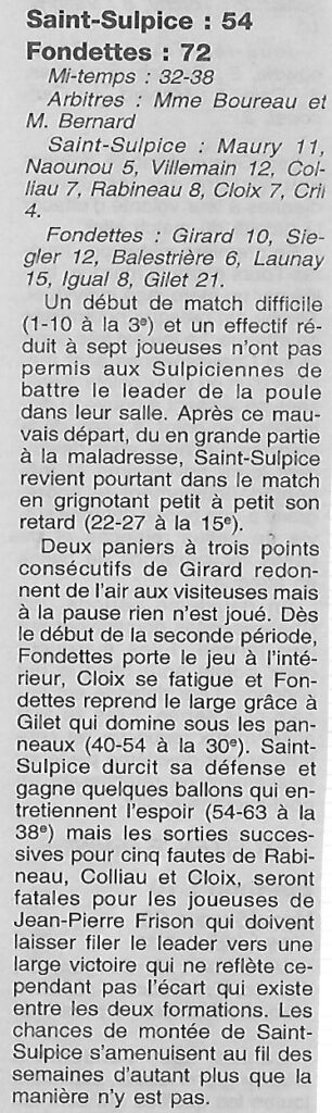 Saison 2000-2001 : En Championnat d’Excellence Régionale Féminine, lors de la Journée du 21 Janvier 2001, Fondettes bat Saint-Sulpice