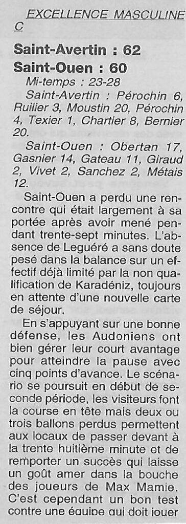 Saison 2000-2001 : En Championnat d’Excellence Régionale Masculine C, lors de la Journée du 21 janvier 2001, Saint-Avertin bat Saint-Ouen