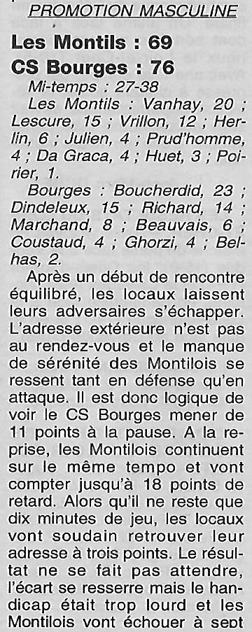 Saison 2000-2001 : En Championnat de Promotion d’Excellence Masculine B, lors de la Journée du 28 Janvier 2001, le CS Bourges bat Les Montils