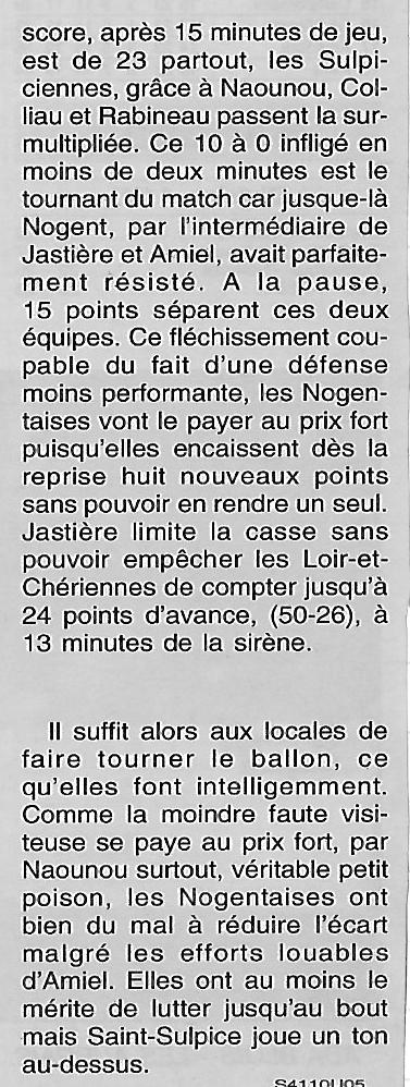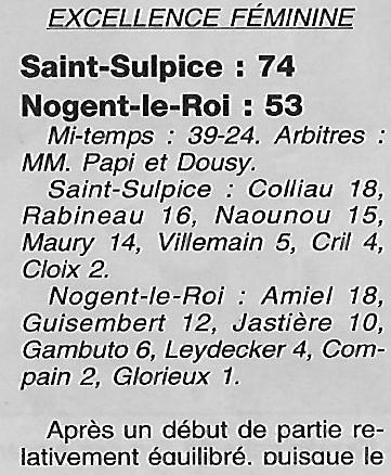 Saison 2000-2001 : En Championnat d’Excellence Régionale Féminine, lors de la Journée du 4 Mars 2001, St Sulpice bat Nogent le Roi