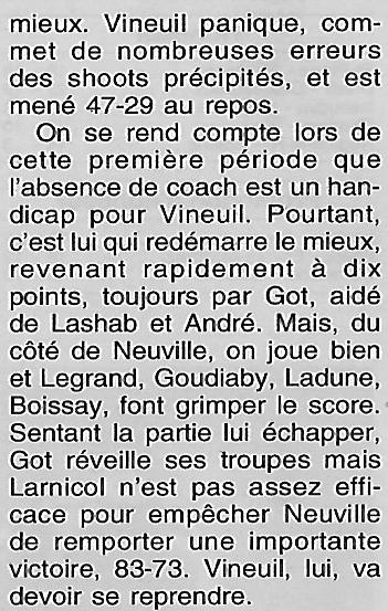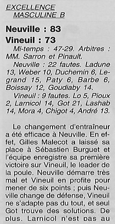 Saison 2000-2001 : En Championnat d’Excellence Régionale Masculine B, lors de la Journée du 4 Mars 2001, Neuville aux Bois bat Vineuil